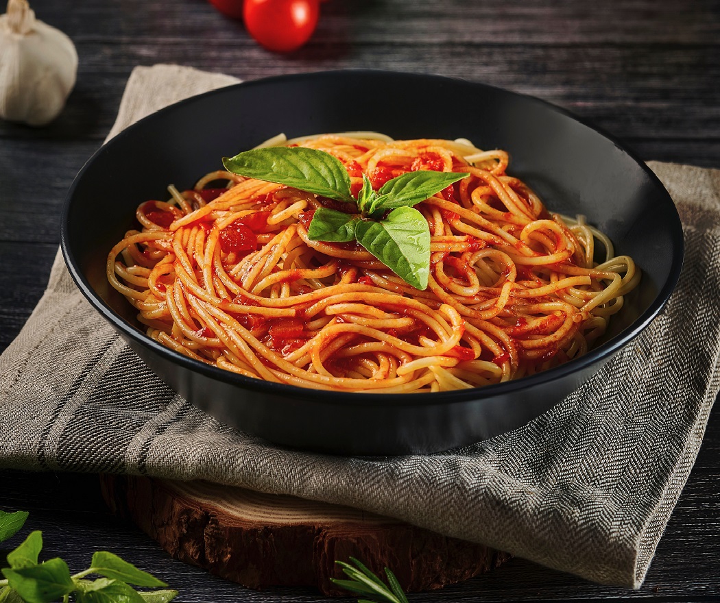 Spaghetti tossed in a tomato sauce with olives, garlic, capers, hot pepper, and anchovies