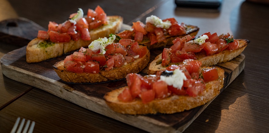 Combination of tomato, basil, and balsamic vinegar topped on lightly grilled baguette slices